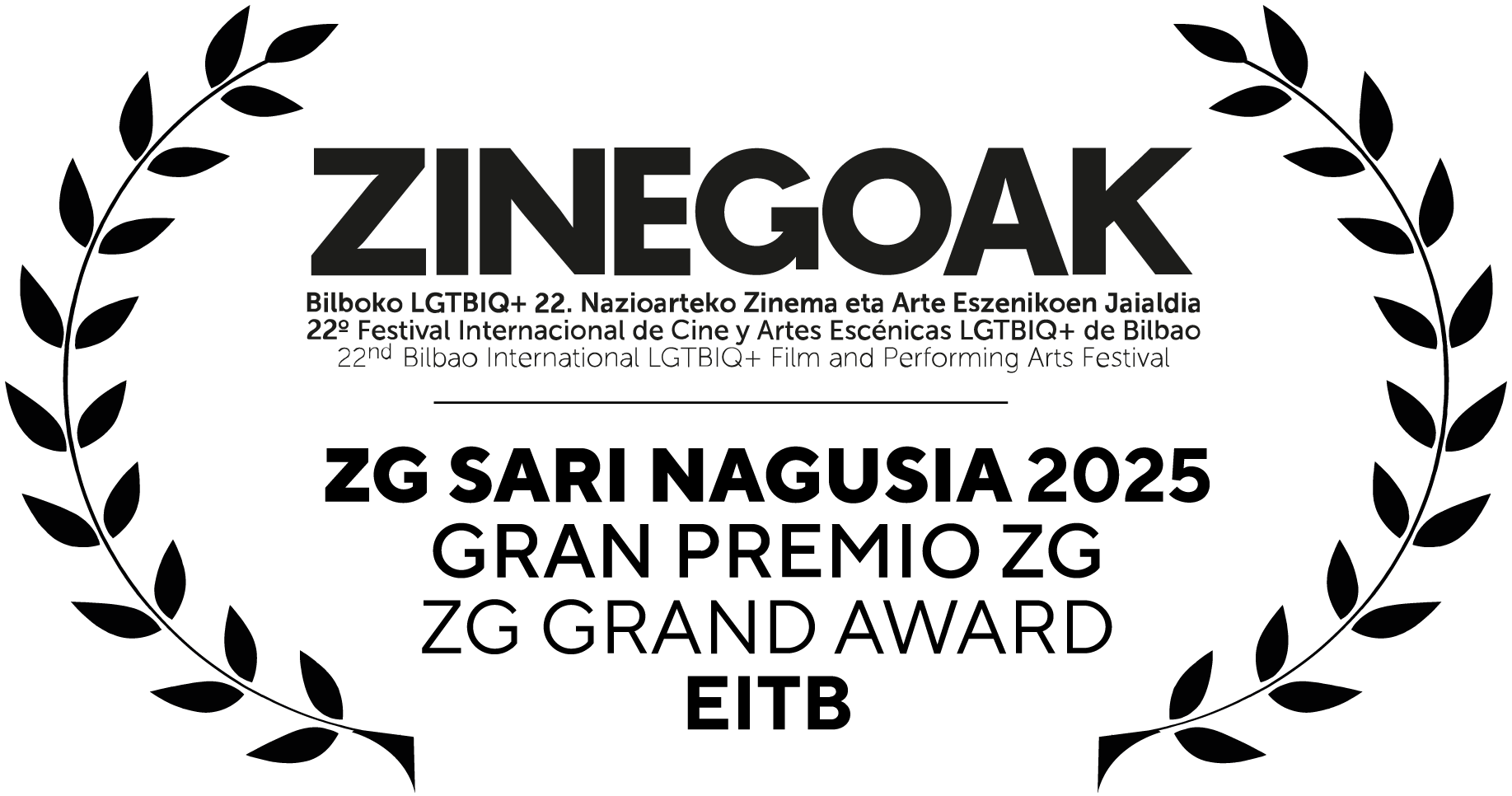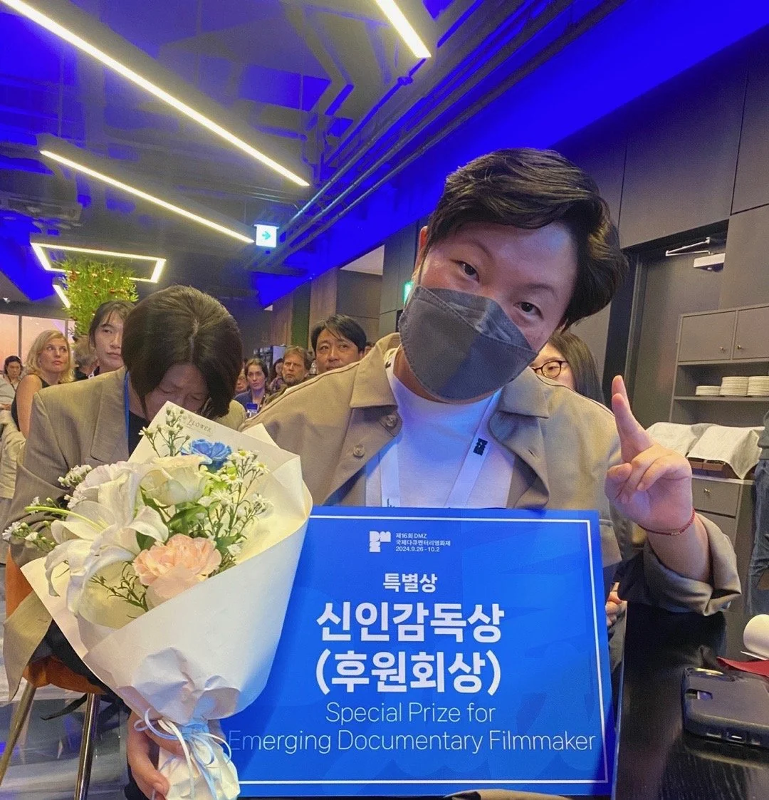 photo id: Jota holds a small bouquet and A placard that reads “special prize for emerging doc filmmaker” at DMZdocs Intl film festival 2024. Their head is tilted to the side as they smile at the camera behind a grey mask.